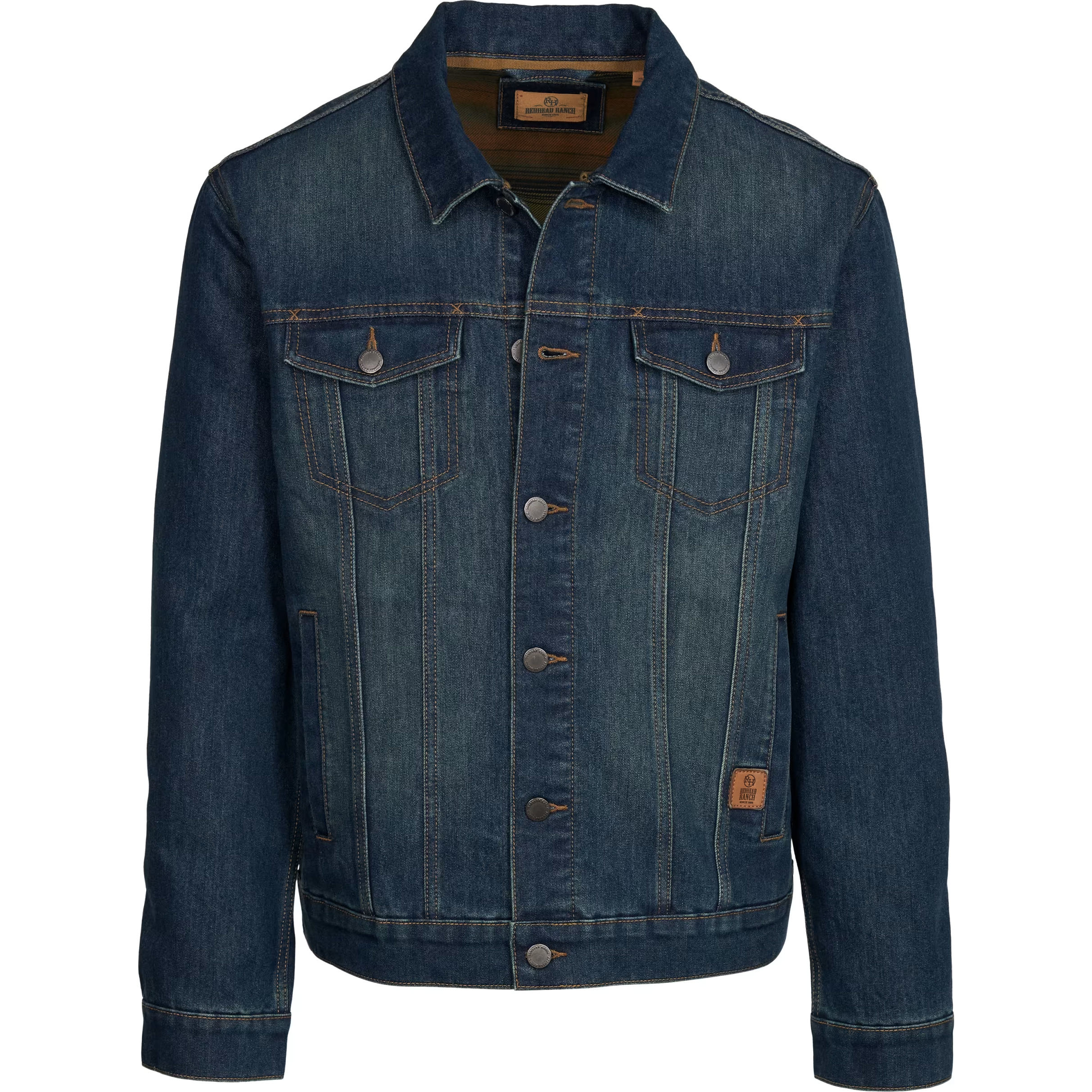 It's as durable as they come. Almost as durable as the person wearing it. Our RedHead® Ranch Ten Sleep Denim Jacket for Men has heavyweight, thick denim over a brushed lining for an outstanding combination of rugged dependability and easy-wearing comfort. The rigid collar provides handsome styling, and the button front with large metal buttons and button-flap chest pocket gives a timeless look. Double stitching throughout reinforces this RedHead denim jacket, and the button cuffs add extra style points. Hand pockets give your digits a warming boost and keep essential gear close, and the RedHead Ranch patch on the front lower left shows you know the best name in field-tested apparel. RedHead Ranch fit is slimmer through the chest, waist, shoulder, sleeve, and elbow than RedHead. Body: 63% cotton/36% polyester/1% spandex. Lining: 97% cotton/3% spandex. Body Length (Based on Size M): 26.75". Machine wash. Imported.