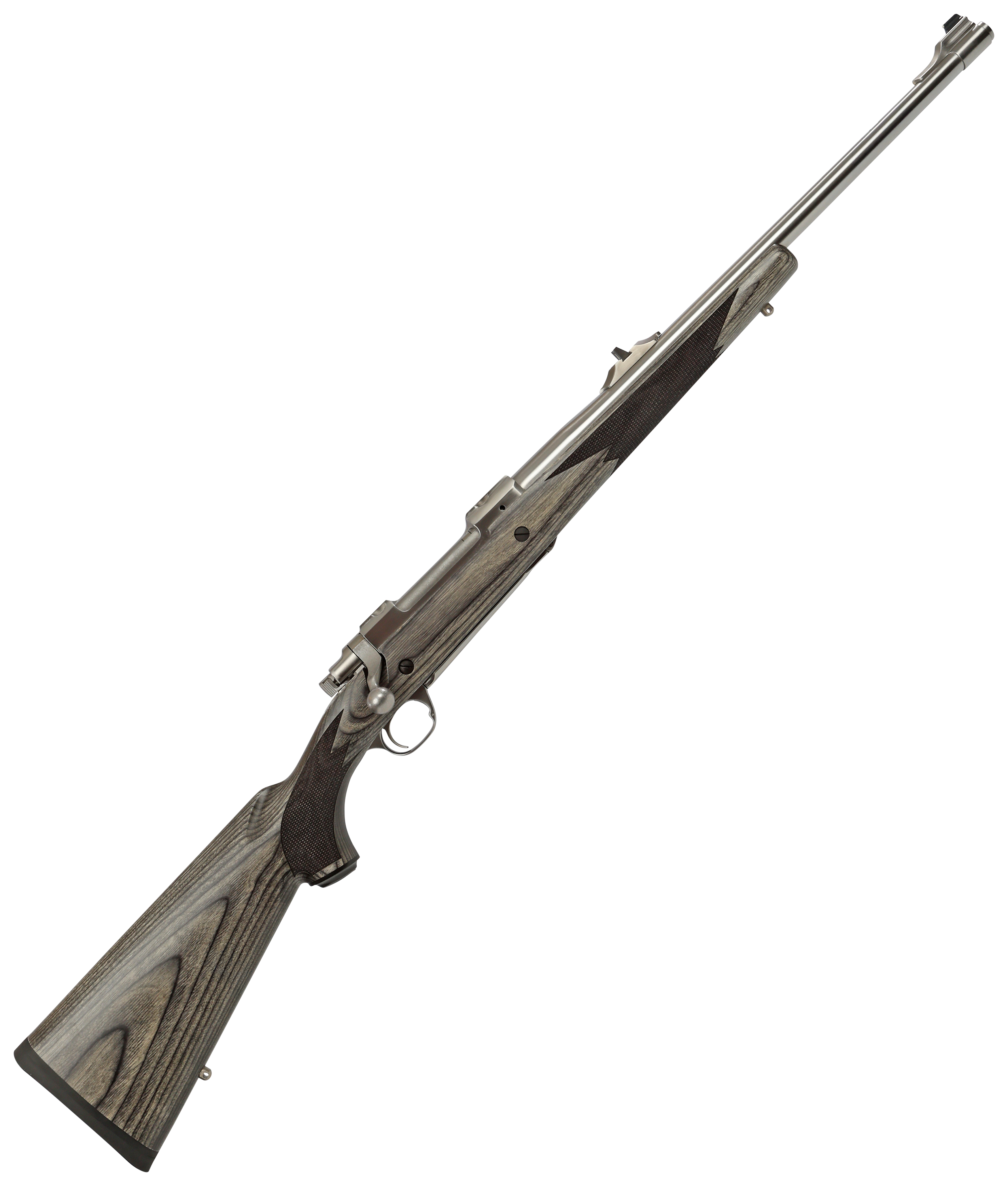 The Ruger® M77 Hawkeye® Alaskan Bush Bolt-Action Rifle delivers big-game power, precision and reliability that you need for long treks in "The Last Frontier." At the core of the rifle is an ultra-reliable action based on the Mauser 98 – considered one of the most dependable actions ever. The M77 Hawkeye action utilizes a controlled-feed mechanism with a large claw extractor that grabs the cartridge's rim tight as it is being fed into the chamber. The controlled-round feed with fixed-blade ejector and one-piece stainless bolt make the M77 Hawkeye a top choice for serious big-game hunts anywhere in the world. The rifle features a 20" stainless-steel, cold hammer-forged barrel with ultra-precise rifling that provides precise accuracy and longevity. The barrel is topped with a shallow express-style, windage-adjustable V-notch rear sight and large white bead front sight for rapid target acquisition. Integral scope mounts machined into the solid-steel receiver provide a stable mounting surface for scope rings. Other features include a black and gray laminate stock, hinged floorplate for easy loading without having to chamber each cartridge, and 3-position safety.