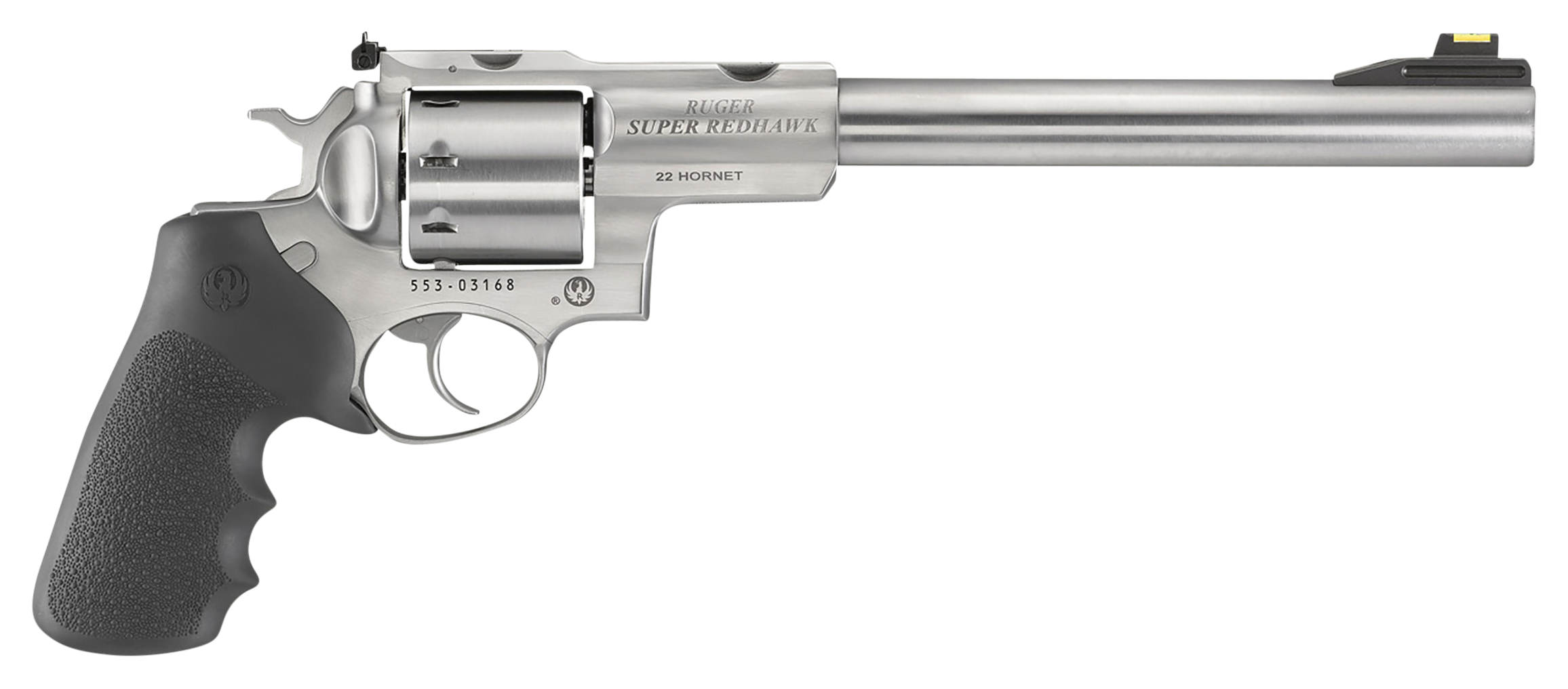 The Ruger® Redhawk® DA/SA Revolver - .22 Hornet has a well-earned reputation as one of the most robust and reliable handguns ever developed – and for good reason. Generations of professional guides, hunters, trackers, and woodsmen have trusted the Redhawk to stop threats cold. To withstand heavy recoil, the triple-locking cylinder is locked into the frame at the front, rear, and bottom – so it stays aligned without getting loose over time. Stainless steel construction provides corrosion resistance and reliability, and it disassembles into large components without tools, making it easy to maintain. The Redhawk utilizes a single spring for both hammer and trigger that provides a smooth double-action trigger pull. The single-action pull is crisp and light. And as with all Ruger double-action revolvers, the Redhawk features the patented Ruger transfer bar mechanism that provides an unparalleled measure of security against accidental discharge – the revolver can be dropped directly on its hammer and will not fire. The rear sight is fully adjustable. Front sight has a colored front blade insert. Hogue® Tamer monogrip.
