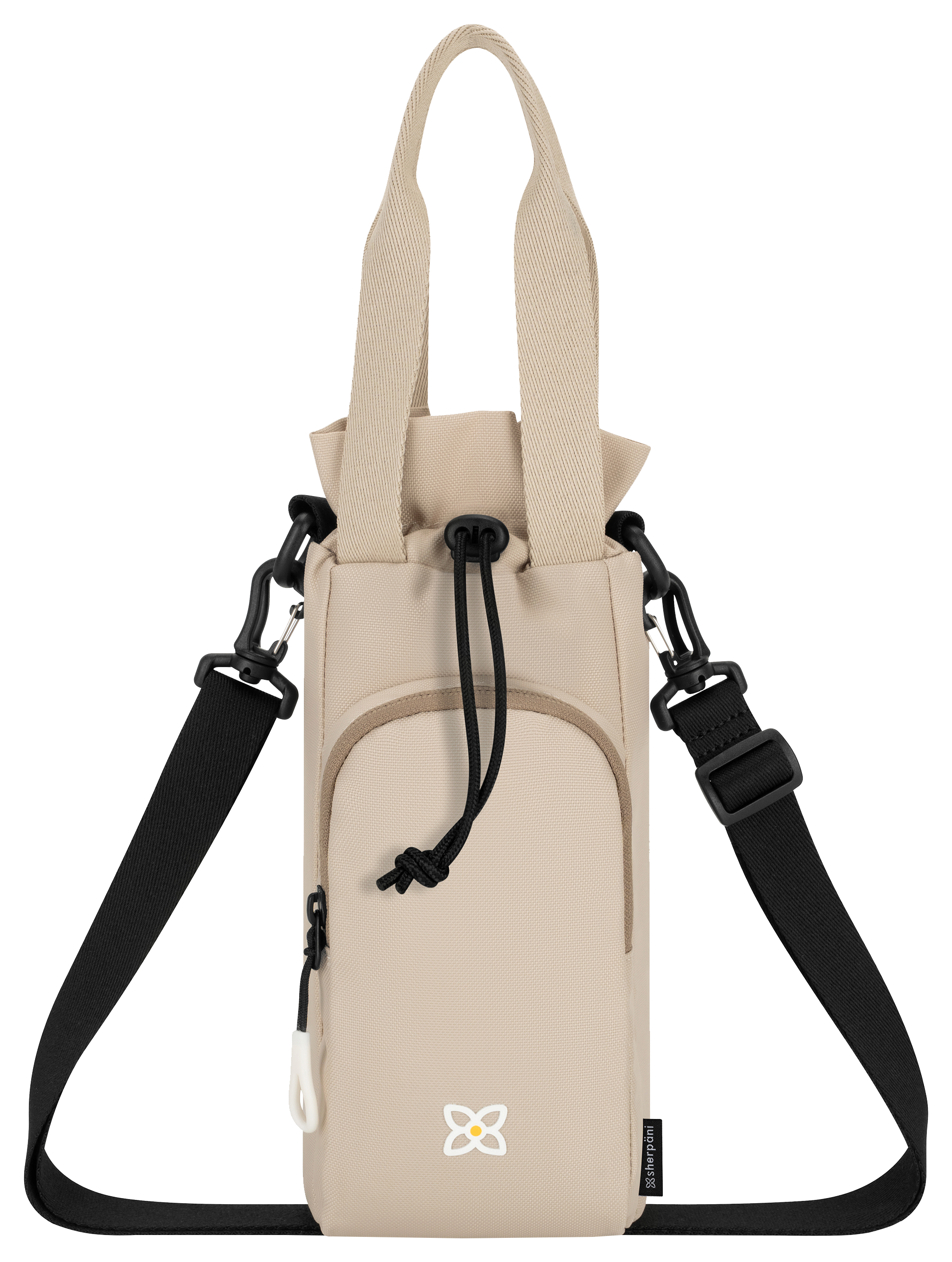 Never leave your water bottle behind again! The Sherpani® Water Bottle Crossbody Bag features a drawstring main compartment that keeps your hydration close at hand. Plus, a zippered, RFID-protected front pocket and a mesh slip pocket on the back side offer room to carry other essentials like your phone, wallet, or keys. Adjustable, detachable crossbody strap and convenient grab handles let you carry your way. Meets the size standards for personal items for most U.S. airlines. 100% recycled polyester. 11"H x 4"W x 4"D. Capacity: 2L. Weight: 8.5 oz. Shoulder Strap: 26"–49".