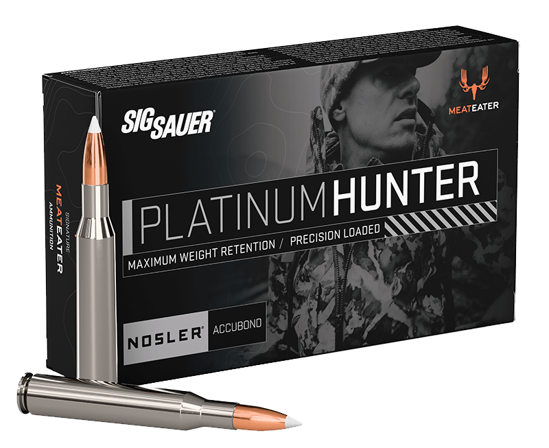 Created in tandem with the hunting experts at MeatEater, SIG SAUER® Platinum Hunter .270 Win 150 Grain AccuBond Centerfire Rifle Ammo is the finest round in SIG's hunting lineup. It's loaded with the Nosler® AccuBond projectile for unmatched weight retention and deep penetration on big game. Each projectile is enclosed in a corrosion-resistant nickel case for smooth cycling and top-tier reliability in bad weather. Each round is waterproofed for extreme weather resistance.