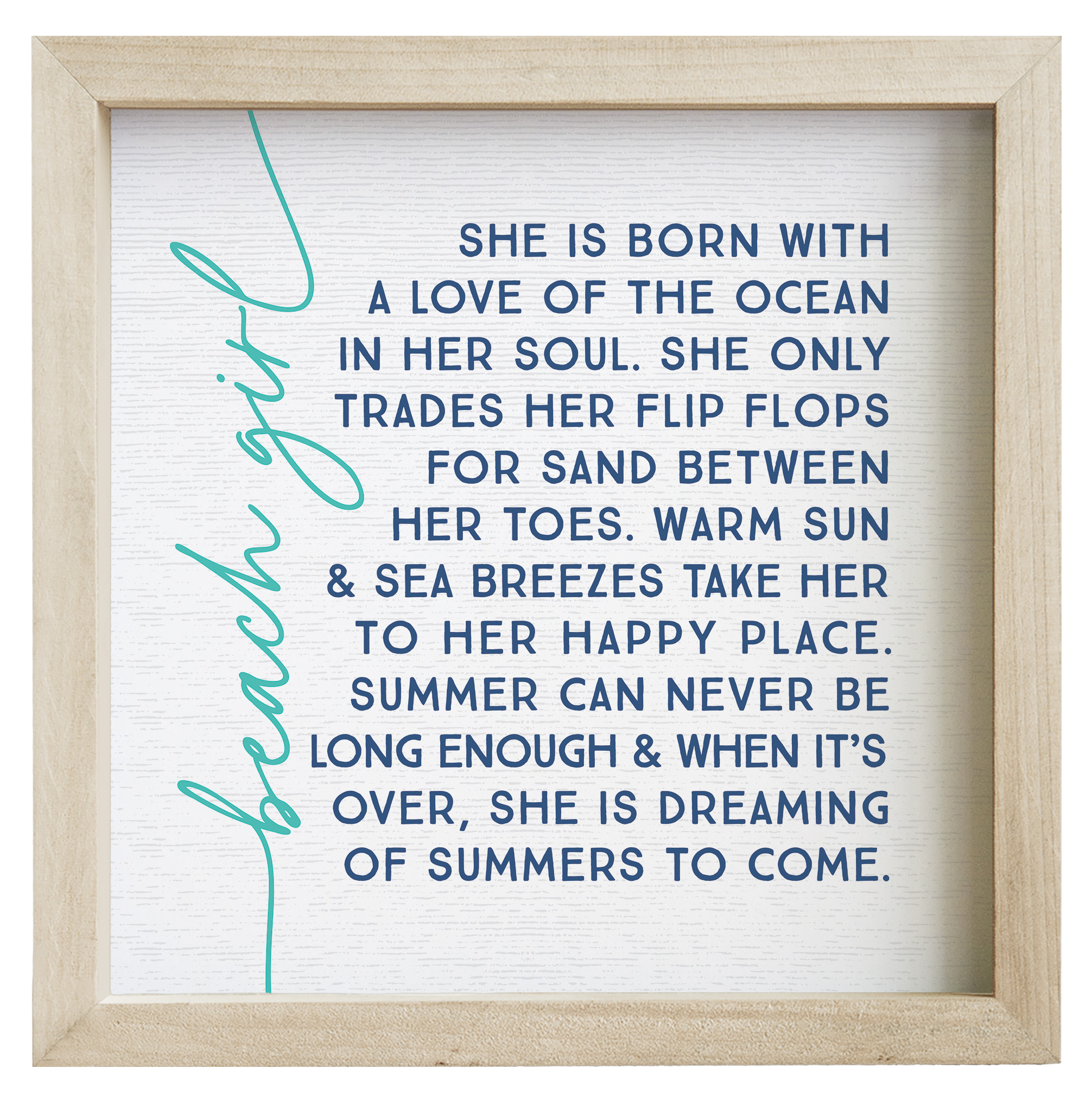 The Sincere Surroundings Beach Girl Framed Sign is perfect for anyone who dreams of days on the sand with the sun on their shoulders and waves lapping their toes. The wood frame adds depth and makes it easy to display by hanging it or propping it on a tabletop. MDF insert. 10"H x 10"W x 1.5"D.