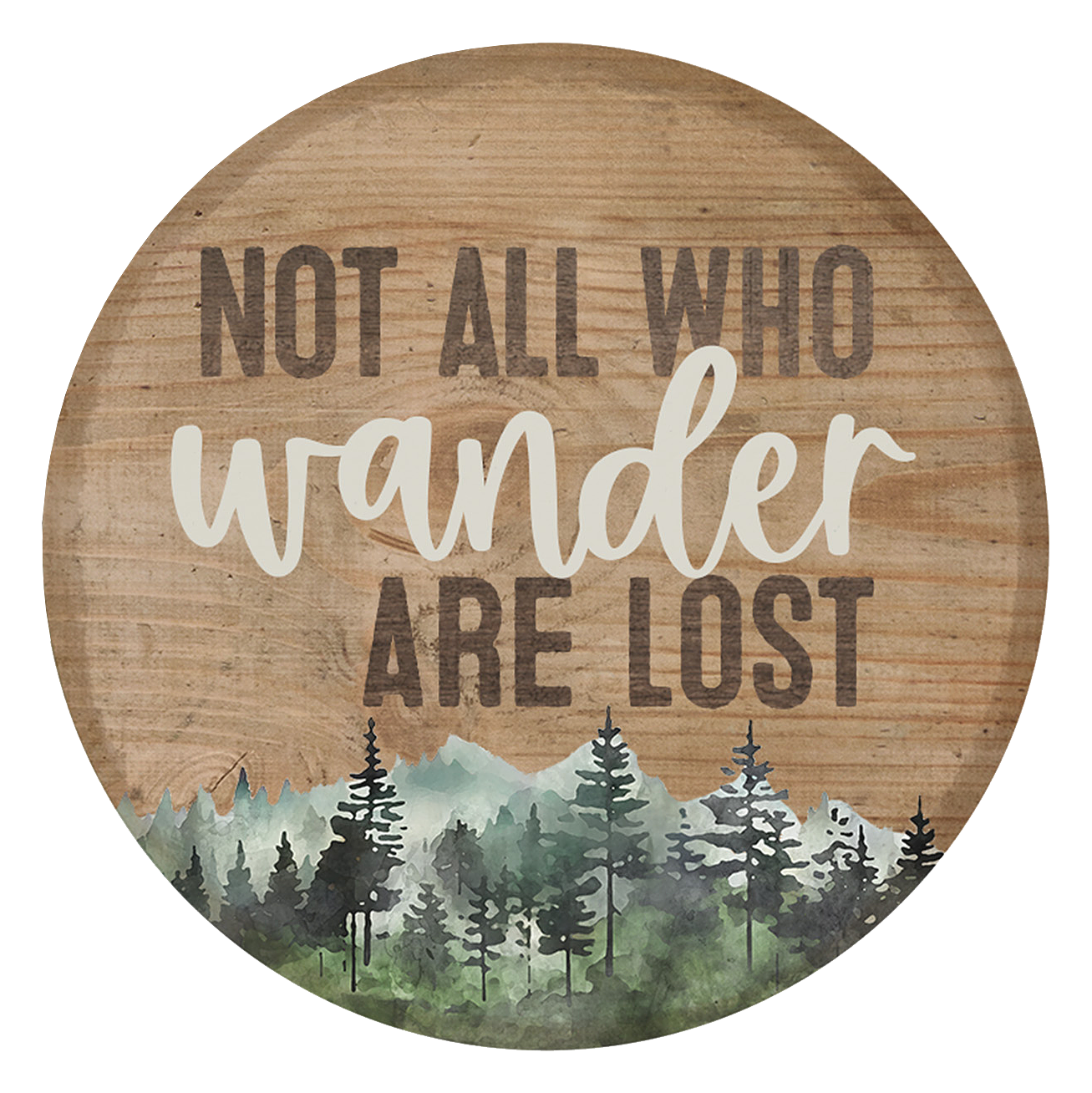 The Sincere Surroundings Wander Lost Mountains Round Magnet! It features a rustic MDF wood circle that displays the phrase, "Not all who wander are lost" above a graphic of a mountain forest. It's a minimalistic yet stylish way to show off your love for the wild! Secure magnetic backing allows you to display this wood magnet on your fridge, filing cabinet, and more. Weight: .08 oz.