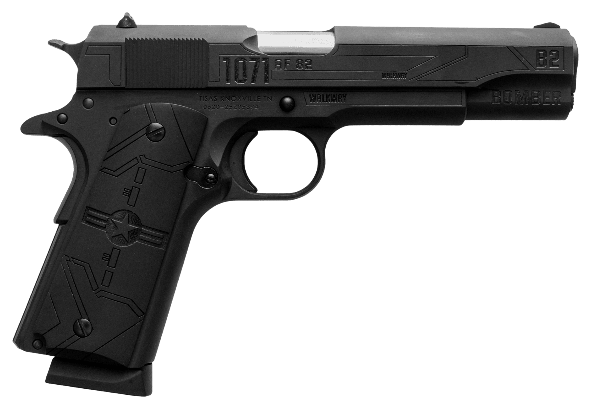 Crafted in collaboration with Metal Made, the Tisas USA 1911 B2 Stealth Semi-Auto Pistol is a unique and collectible sidearm dressed all in black. The B2 Stealth features a forged steel slide and frame, Colt® 70-series internals, Black Cerakote® finish, and engraved artwork on the slide and aluminum grips. Slide engravings vary model to model – no two are exactly alike. Standard 1911 features include a single-action-only trigger, fixed combat sights, manual thumb safety, and beavertail grip safety.