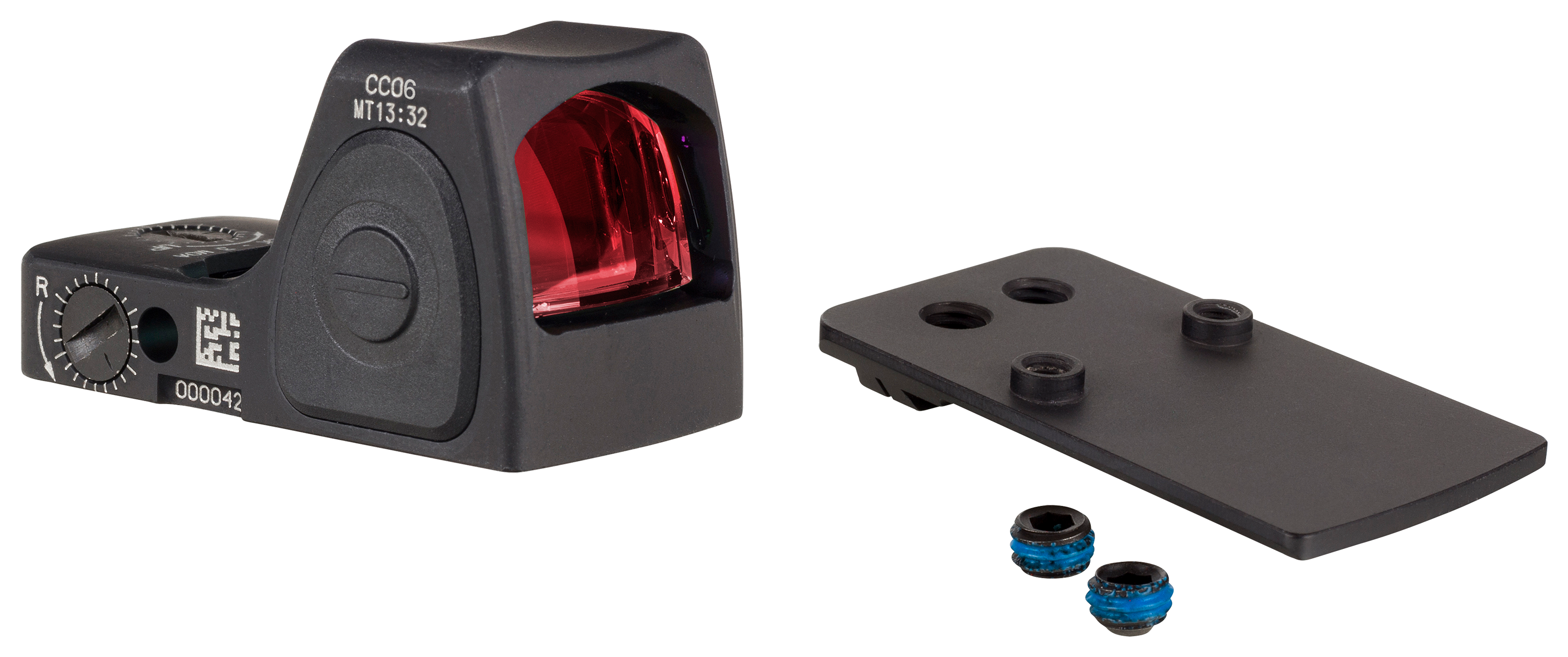Speed matters, and the Trijicon® RMRcc Red Dot Sight and Pistol Mount Combo features a thinner, lower-profile design that reduces the risk of snagging for a faster draw than ever before. Featuring a bright 3.25 or 6.5 MOA red dot reticle with 8 user-adjustable brightness levels, this pistol red dot sight was specifically designed for concealed carry and competition shooting applications. A button lock-out mode secures the auto-brightness setting, automatically adjusting to ambient light for quick draw in everyday-carry scenarios, while the lock-in mode secures your preferred brightness setting for competition and target shooting. Operating on just a single CR2032 battery (included), this weapon sight offers up to 4 years of reliable operation. The display window provides unlimited eye relief and features true-color, multi-coated lenses for optimal clarity and color fidelity. Plus, the durable housing stands up to challenging environments and heavy recoil. This model includes the adapter plate needed for your specific handgun. Some models will replace the rear sight, using the rear sight dovetail for securing the optic, and professional installation is recommended.