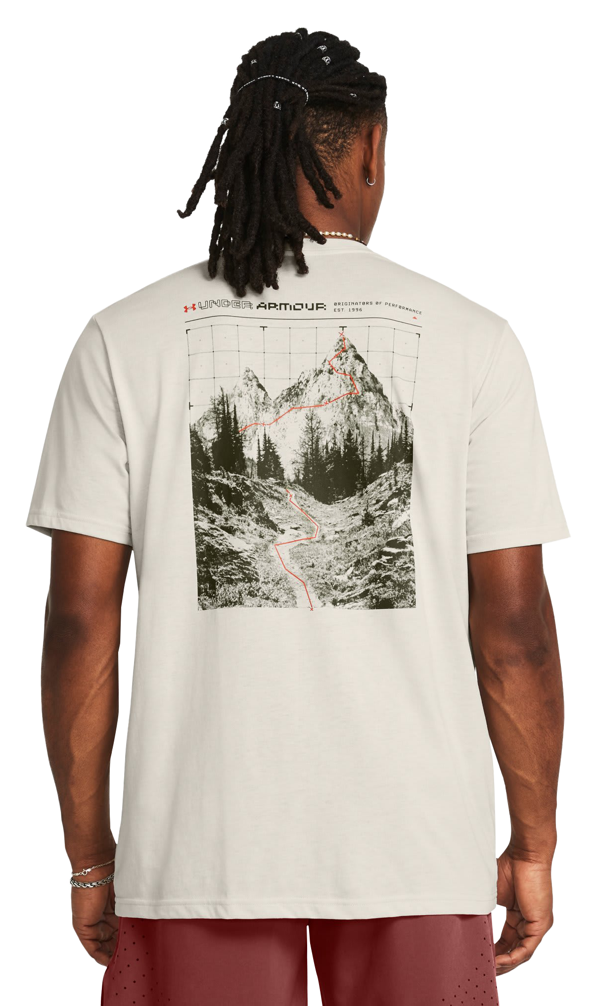 • Back art featuring mountain with digitally marked trail and Under Armour logo