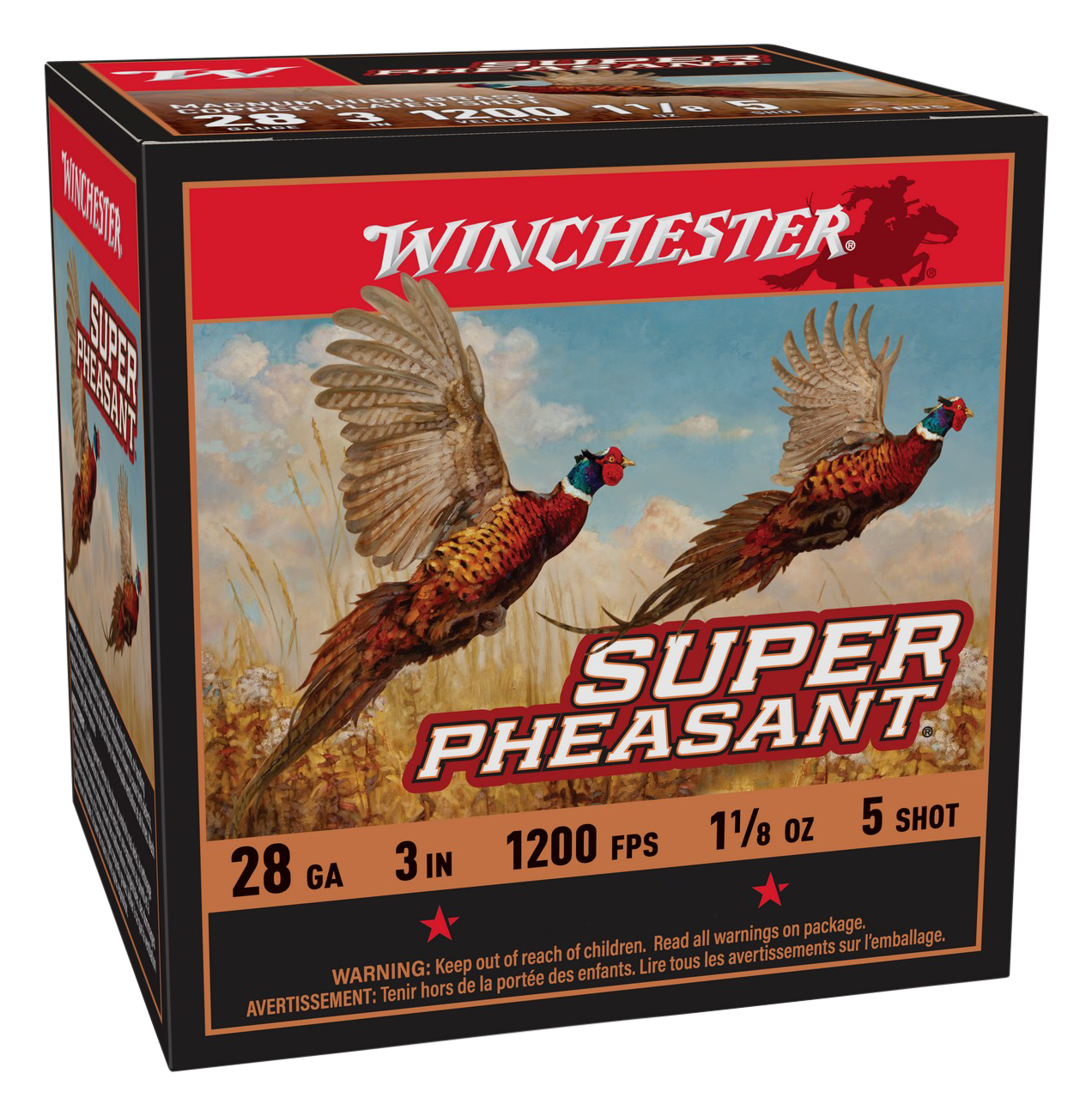 Winchester® Super Pheasant 28-Ga. 3" 1-1/8 oz. Shotshells deliver a copper-plated lead shot at maximum velocity that will drop rooster pheasants way out over the corn stubble, even when they have heavy winter feathers. Specially designed wads provide uniformly tight patterns. Premium hulls with high brass bases function flawlessly in any action.